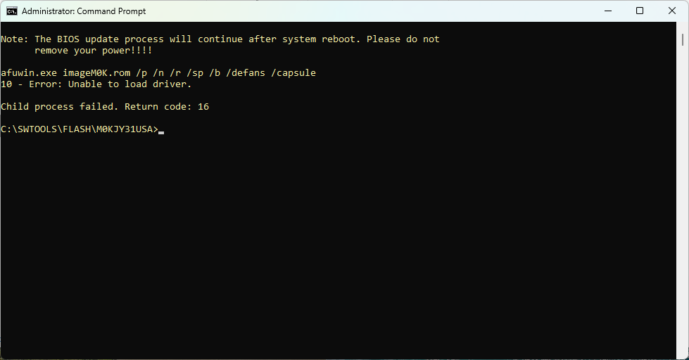 5. Flash the BIOS with the newer version of wflash2.exe. With the sample IMAGEM0K.rom in the M710e folder, we can now proceed to update the BIOS by running the following command in CMD (or PowerShell). Make sure to change the directory to the M710e folder, and run the following command: