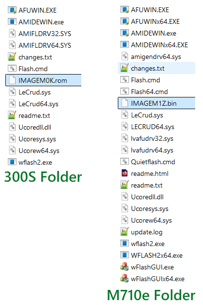 4. Copy the IMAGEM0K.rom from the 300s folder to the M710e folder where the newer utilities are. If we look at both folders, we can see a wflash2.exe file in both of them. The utility is the same, but the older Flash utility in the 300s folder used the wflash2.exe to perform the BIOS update, instead of the newer wFLASHGUIx64.exe utility in the newer version in the M710e folder. Analyzing the Flash.cmd batch file in the 300s folder, we see the following line: